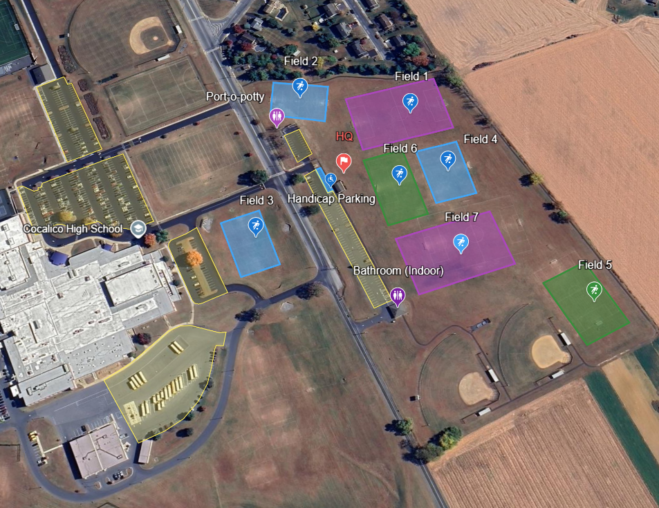 DO NOT PARK ALONG THE ROAD! We will have cones and caution tape marked to emphasize these rules. Local police patrol the roads during this event and will issue tickets or tow if cars are parked along the road. The school will fine us for anybody that parks in the grass. We have plenty of parking across the street at the high school, so just be sure to remind parents to arrive early enough to find parking and walk to their appropriate field